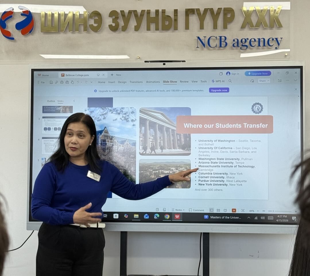 АНУ-ын Вашингтон муж дахь Bellevue College талаар танилцуулга мэдээлэл өгөн, монгол хүүхдүүдийг уг коллежэд суралцахад анхаарах, мэдэж авууштай зүйлсийн талаар мэдээлэл өгөх зорилготой семинар 2026.04.15-ны өдөр зохион байгуулагдлаа. Уг семинарын хүрээнд хүүхдүүд зочин илтгэгч Sandra Bonifield-тэй нээлттэй ярилцан Bellevue College-ийн талаар дэлгэрэнгүй мэдээлэлтэй болж, сэтгэл хангалуун семинар маань өндөрлөсөн юм. Алс холоос хүрэлцэн ирж, үнэтэй мэдээлэл хуваалцсан Bellevue College-ийн Олон улсын элсэлтийн зөвлөх Sandra Bonifield-д чин сэтгэлийн талархал илэрхийлье.