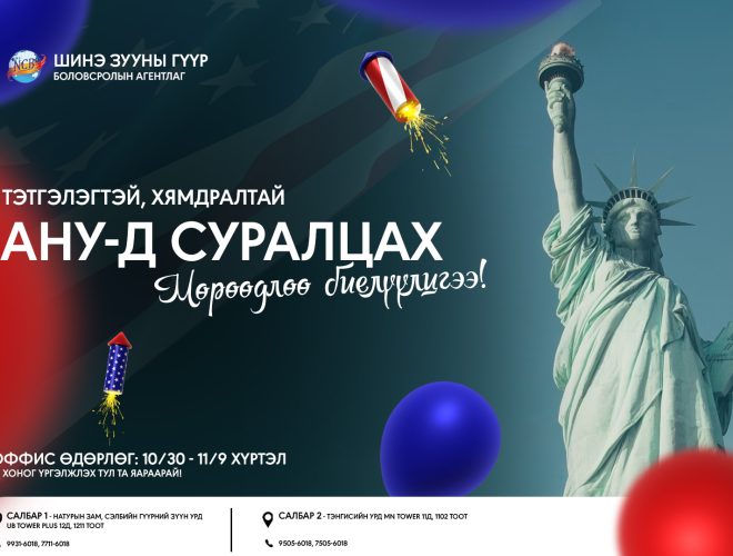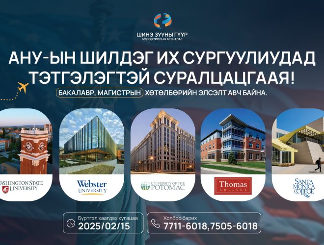 АНУ-д суралцах мөрөөдлөө биелүүлцгээе! АНУ-д суралцах мөрөөдлөө биелүүлцгээе! 7 months ago in 🌟 Тэтгэлэгтэй, хямдралтай АНУ-д суралцах мөрөөдлөө биелүүлцгээе!🌟 📅 Оффис өдөрлөг: 10/30 - 11/9 хүртэл 10...