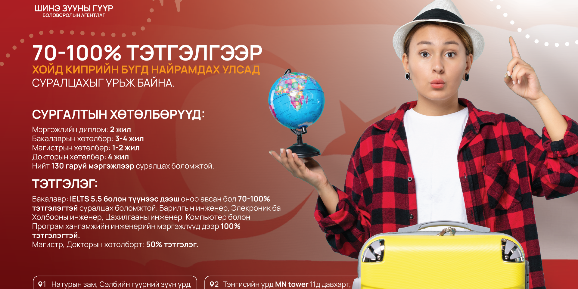 Хойд Кипр Улс нь Газар дундын тэнгисийн үзэсгэлэнт орон бөгөөд наран шарлагын газрууд, эртний дурсгалт газрууд, дулаан уур амьсгалаараа алдартай. Байгалийн сайхан, соёлын өвийг төгс хослуулсан энэ улсад байрлах European University of Lefke нь 1990 онд Киприйн Шинжлэх Ухааны Сангийн санхүүжилтээр байгуулагдсан бөгөөд 80 орны 12,000 гаруй оюутан суралцдаг. Тус сургууль нь Их Британийн Брадфорд Их Сургуулийн магадлан итгэмжлэлтэй бөгөөд бакалавр, магистр, докторын зэрэг олгох 130 гаруй хөтөлбөртэй. Мөн олон улсын оюутнуудад 70-100 хувийн тэтгэлэг авах боломжийг санал болгож байгаа. Виз авах шаардлагагүй, санхүүгийн баталгаа хэрэггүй бөгөөд IELTS оноотой байхад хангалттай юм. Илүү дэлгэрэнгүй мэдээлэл авахыг хүсвэл өөрт ойр салбарт хүрэлцэн ирж үнэгүй мэдээлэл, зөвлөгөө аваарай!